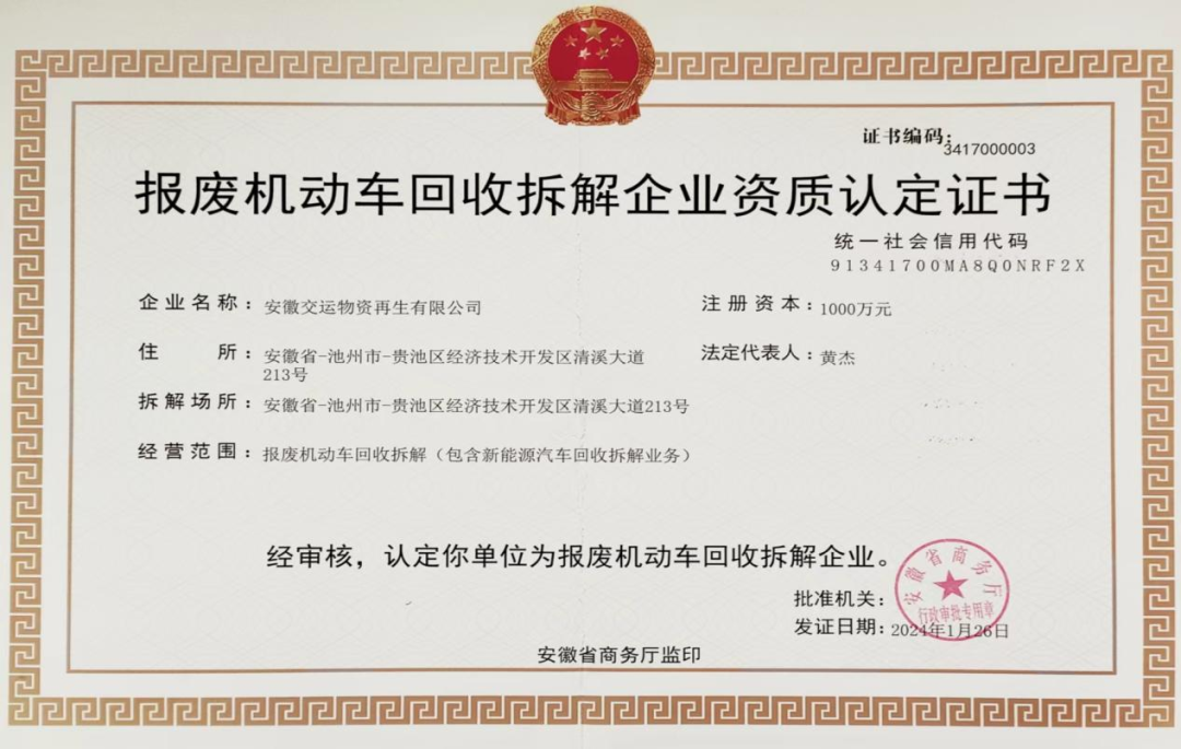 近日,集團(tuán)所屬安徽交運(yùn)物資再生有限公司順利通過安徽省商務(wù)廳批準(zhǔn),成功獲得報廢機(jī)動車回收拆解企業(yè)資質(zhì)認(rèn)定證書 。